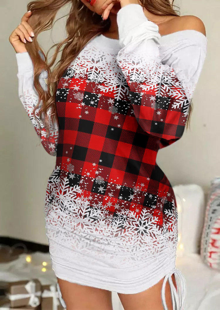 • Christmas Snowflake Plaid Gradient Drawstring Bodycon Dress - White