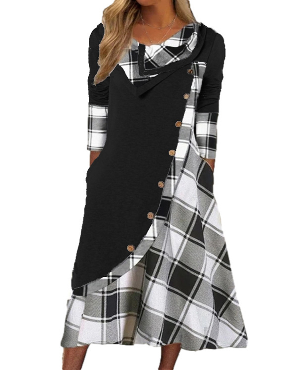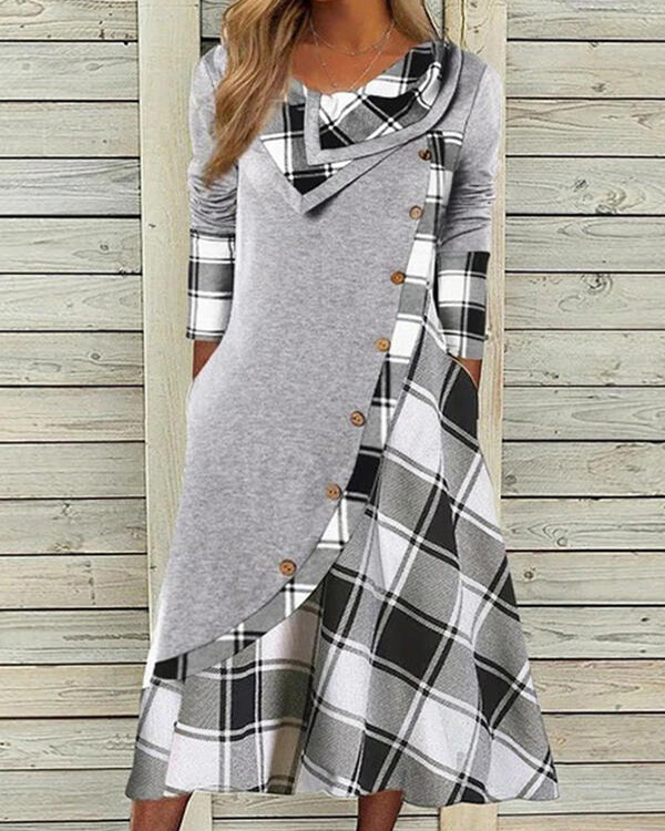 Plaid Long Sleeves Shift Tunic Casual Midi Dresses