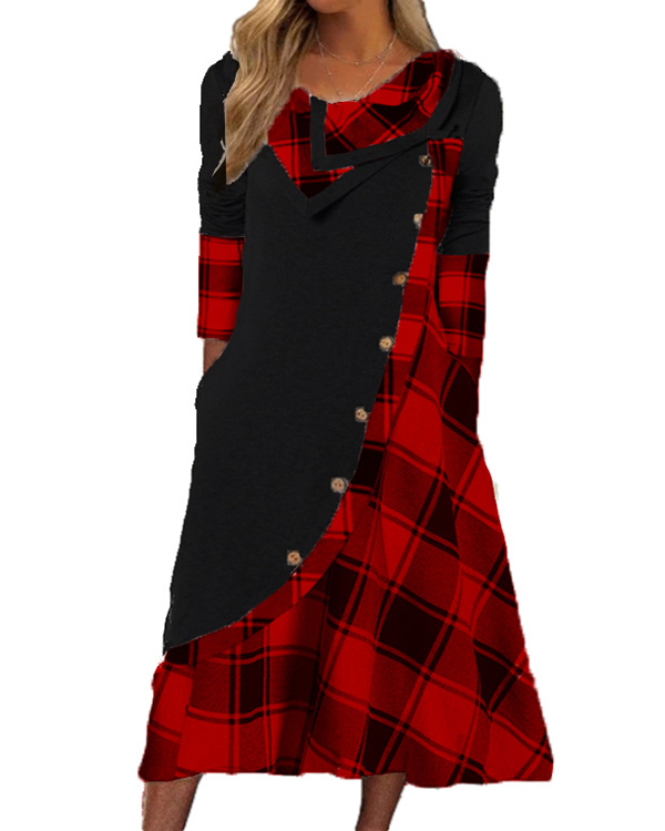 • Plaid Long Sleeves Shift Tunic Casual Midi Dresses